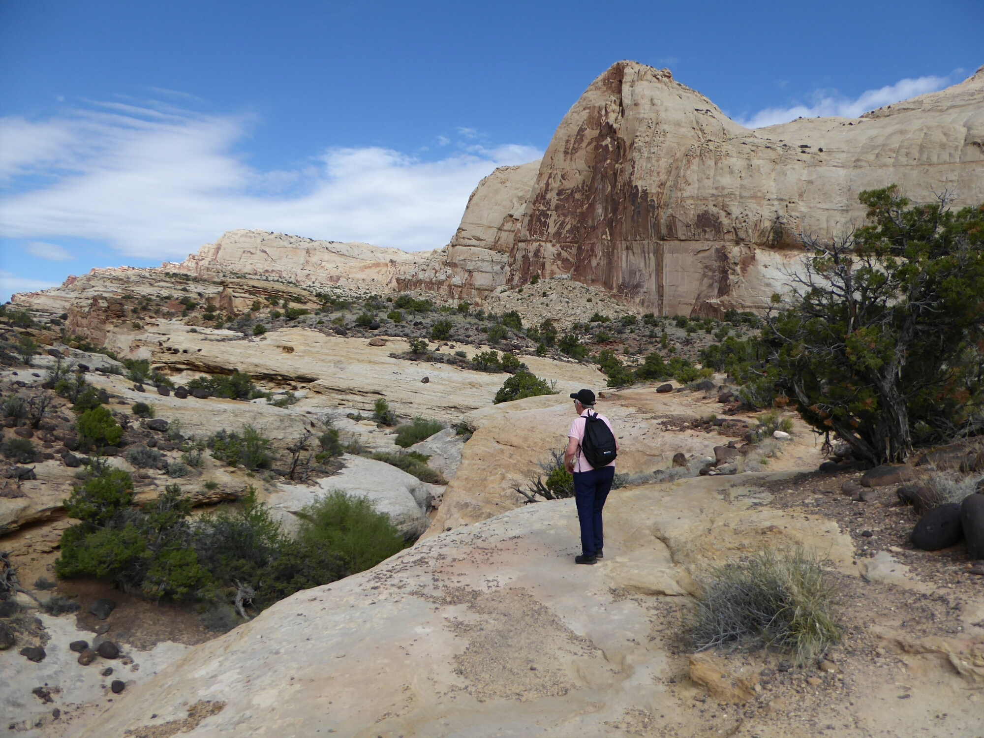 Here we are walking down to the right and we are going to have to walk up that daunting slope in the distance and eventually scramble to the hardly-discernable Navajo Knobs at the highest point. Where there is actually a natural seat. (If you double-click to enlarge the picture the Knobs are the two little bumps on the extreme left – they are higher than the peaks to the right but look smaller because they are further away )