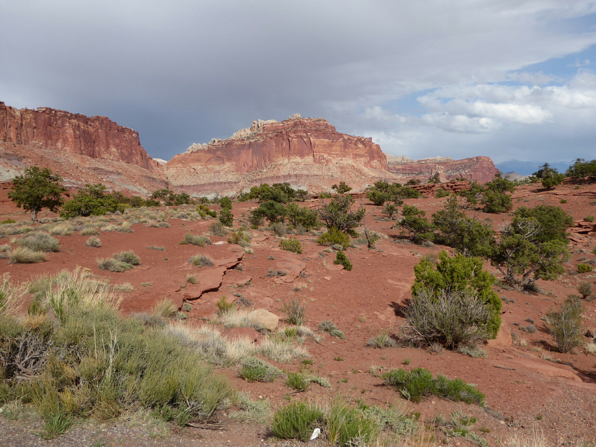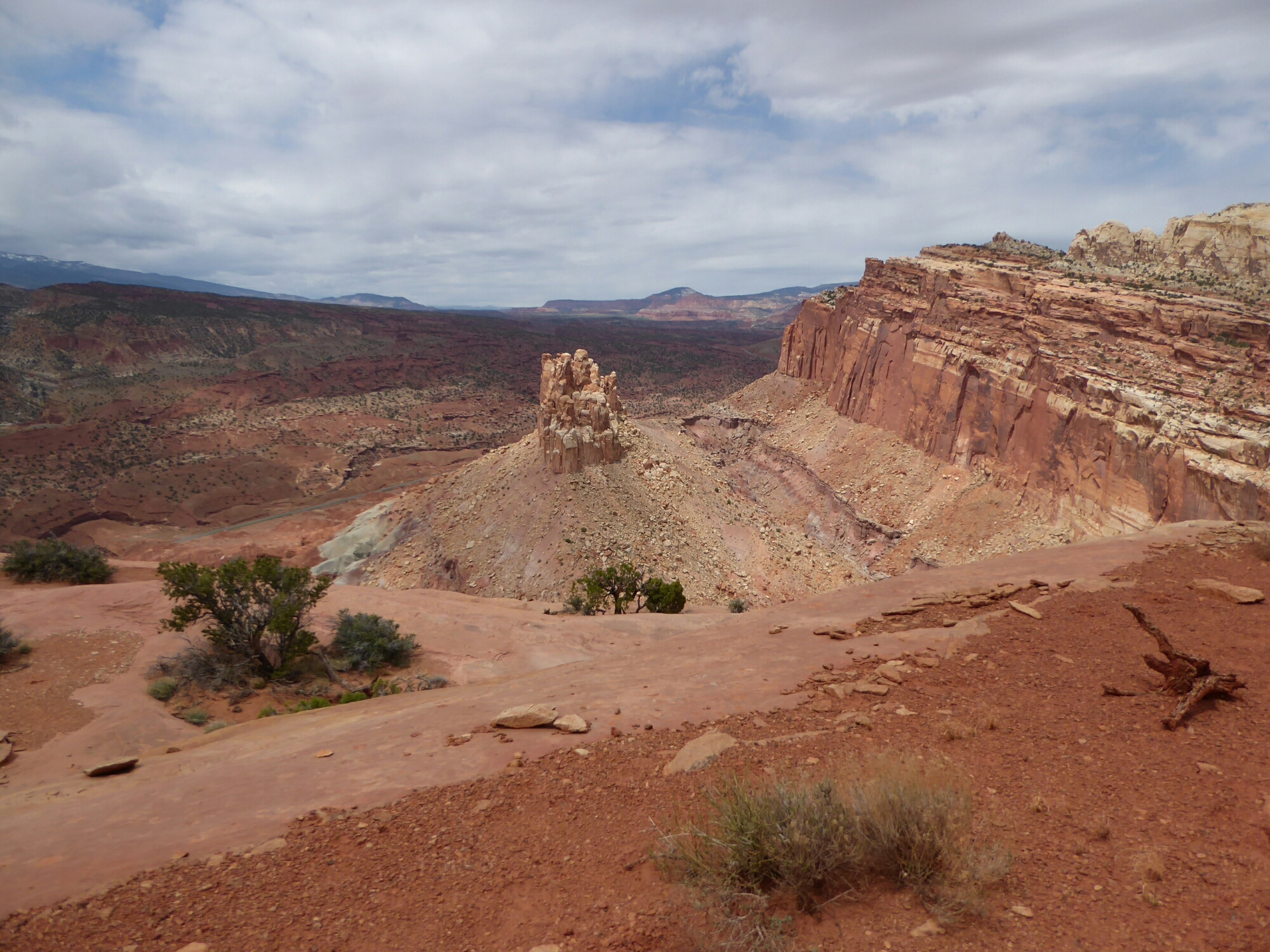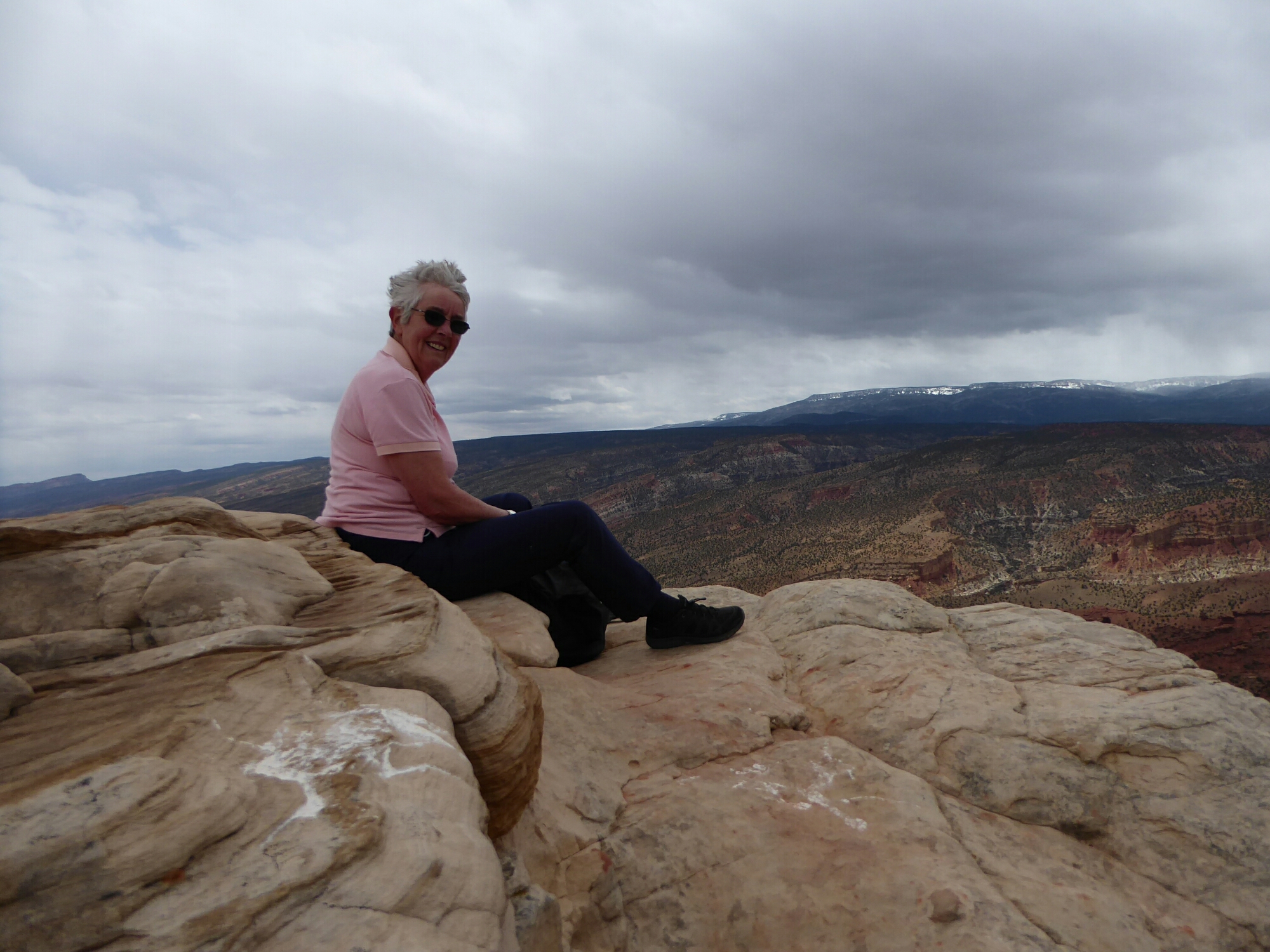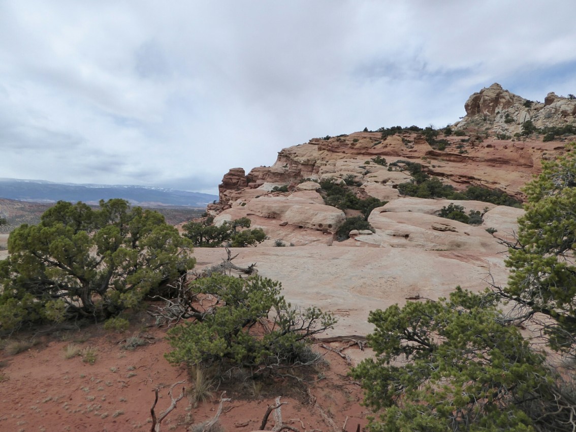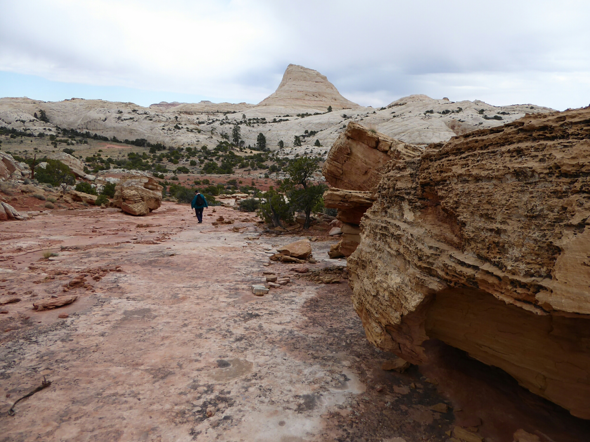 The landscape is stupendously out of this world. In spite of the endless variety of colours and textures the basic pattern was there for the whole walk – great zig-zags along the vast sheets of sandstone – tilted at the same roughly 25° angle as rest of the entire area. Thus we made our way round one great gully cut into the mountainside after another – some seven or eight of them in all.