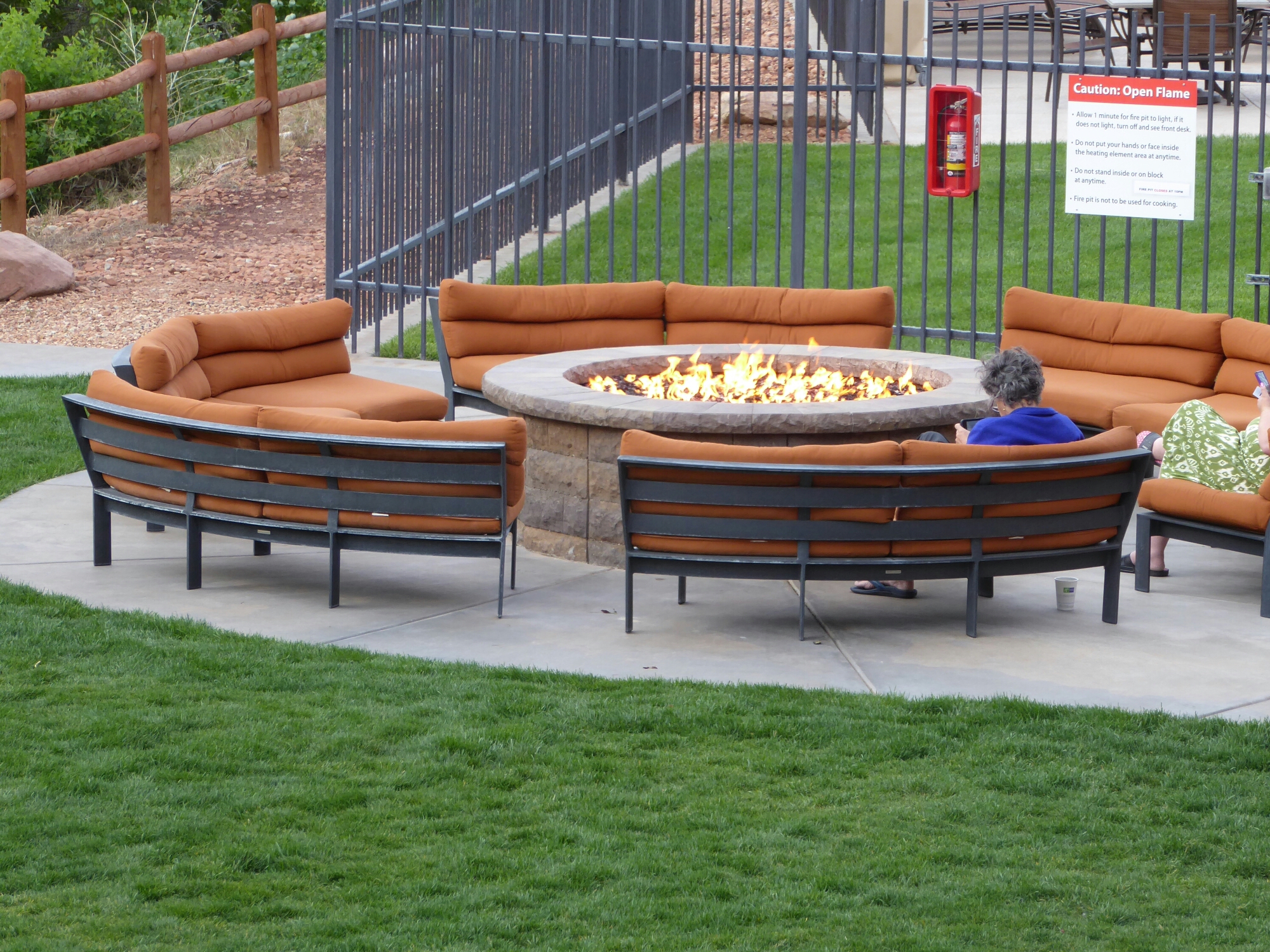 Everywhere in this parched land, water is sprayed on fields and poured into bathtubs as if there is no tomorrow. The only solar panels we have seen anywhere have been tucked away behind National Park Service buildings, while surely an advanced nation properly concerned about the future could easily provide, for example, daytime air conditioning entirely by solar power using nothing more than current technology. On the contrary, the giant cars and palatial camper vans seem to be the embodiment of a stubborn defiance of any restraint on the personal freedom to consume, and waste. The beautiful, brand new hotel we have arrived at in Springdale even has huge, open gas-fired braziers for the further comfort of us spoiled and lucky guests.