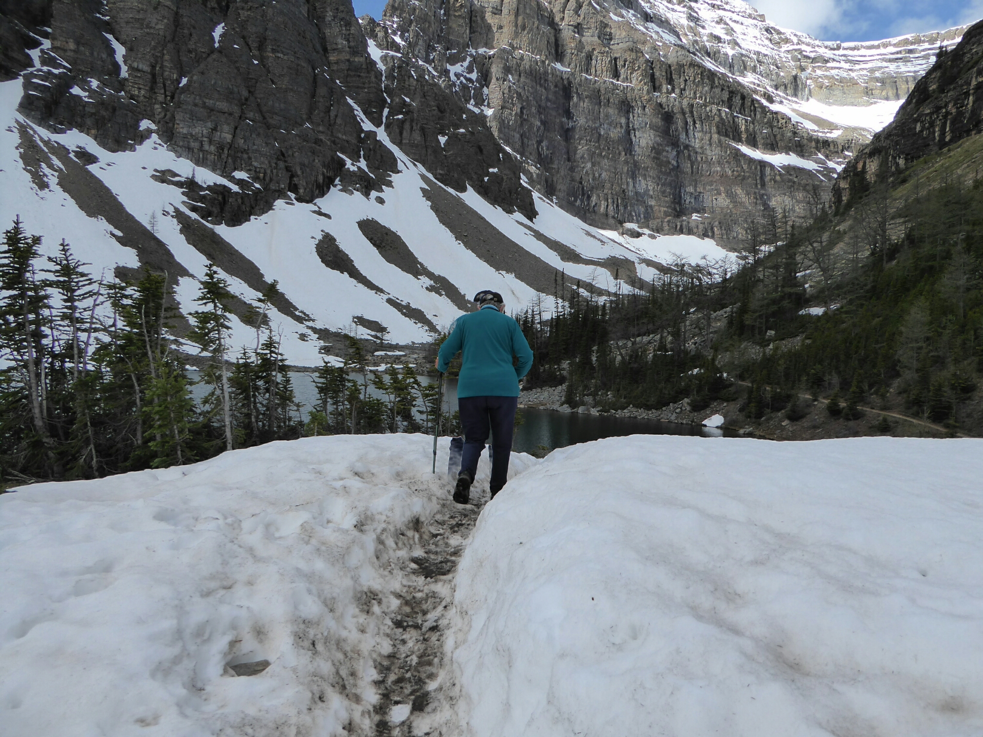 We missed the trail on to the Little Beehive and instead found ourselves on the increasingly difficult scree and snow slopes heading for the Big Beehive which had loomed above Mirror Lake.