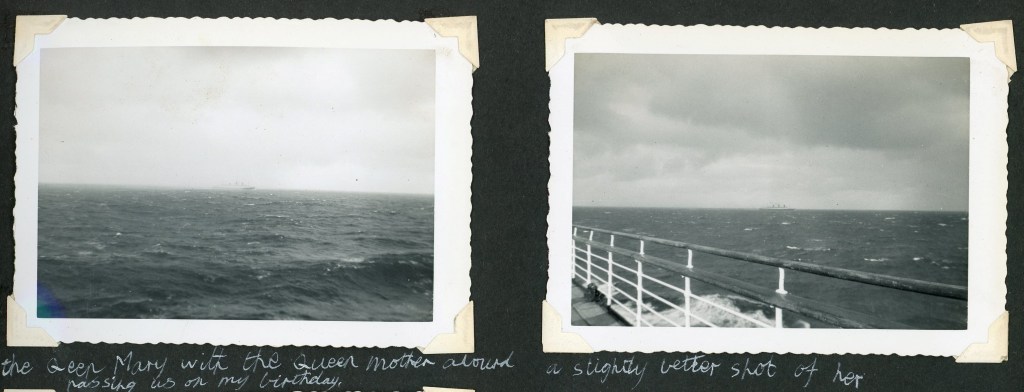 I know we were half way across the Atlantic on that day because that was when we passed the Queen Mary on her way back to England. What’s more, we were told that she had no less a person than Queen Elizabeth the Queen Mother on board for that trip. So I used to boast that three Queens got together on my birthday.