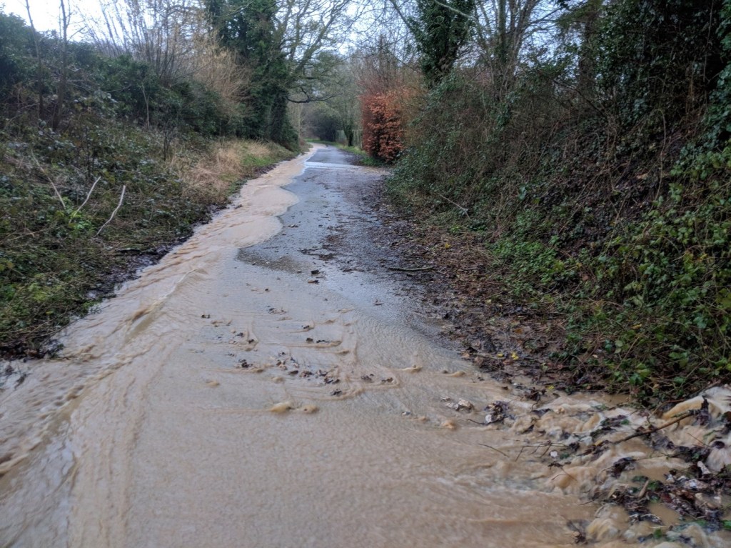 On the outskirts of the town, soil run-off from fields gets into the river after heavy rain and flooding, often travelling down roads. The sediment covers the river bed gravels, smothering aquatic plants and invertebrates. Sediment also transports pesticides and fertilizers again causing suffocating algal blooms. The headwater streams that feed into the main river, such as the Caker stream, are important spawning sites for migratory fish such as the brown trout. The eggs need lots of oxygen, but get smothered by the sediment. The fields at the top of Brick Kiln Lane have been releasing large amounts of sediment into the river during this winter’s rains turning it brown and smothering the gravel.